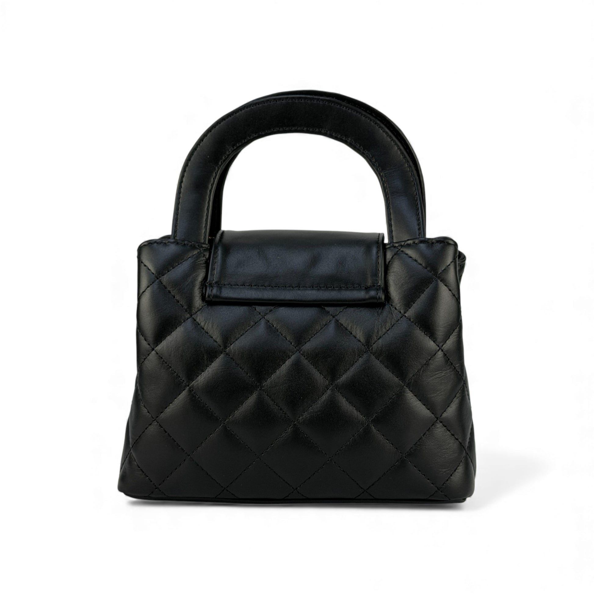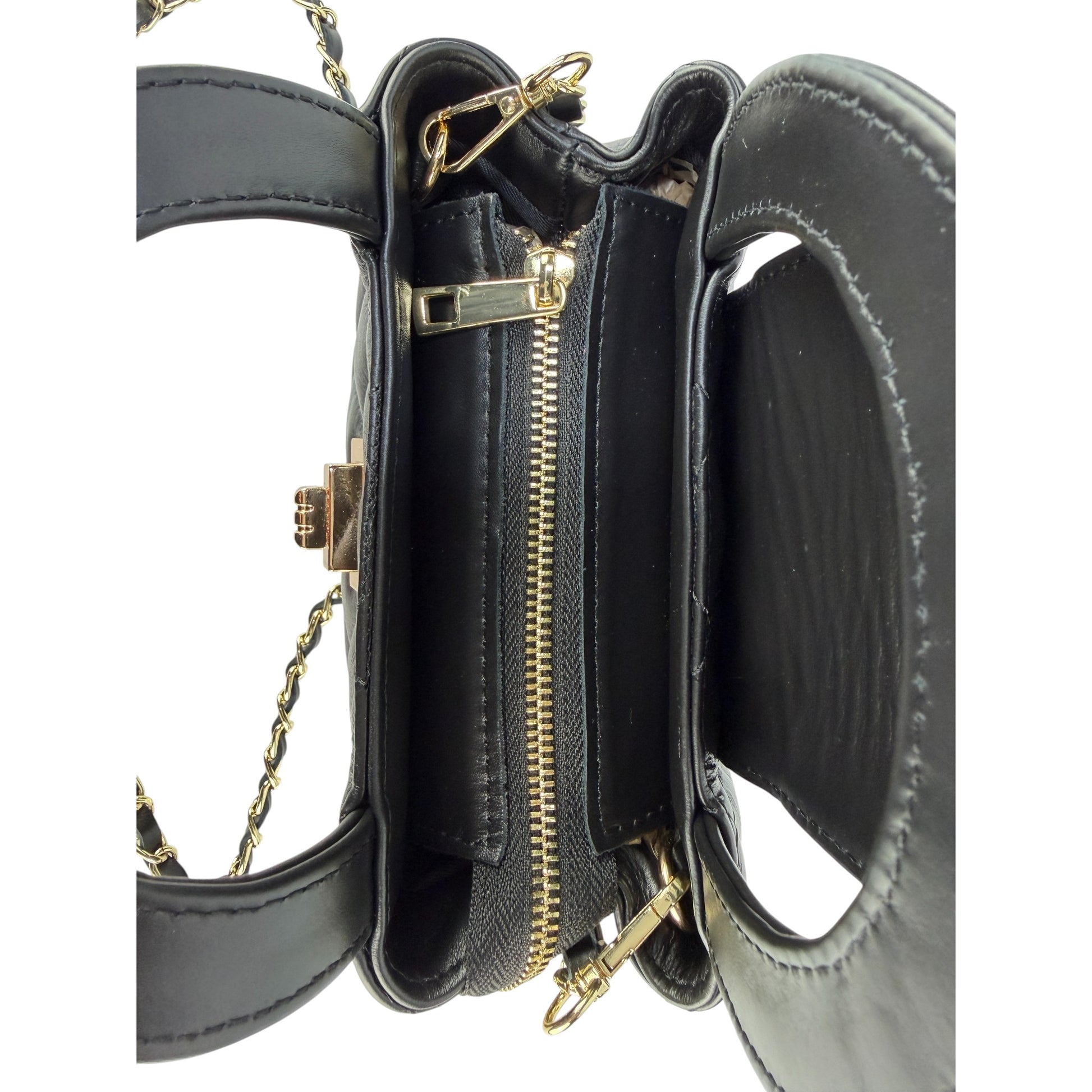 Realizzata in 100% vera pelle italiana trapuntata, ha una grana morbida e una finitura luminosa che esalta i dettagli in metallo dorato. Il manico rigido permette di portarla comodamente a mano, mentre la tracolla a catena con inserto in pelle, rimovibile ma non regolabile, la trasforma in una mini borsa a spalla per la sera. La chiusura con girello dorato sulla pattina frontale aggiunge un tocco gioiello.