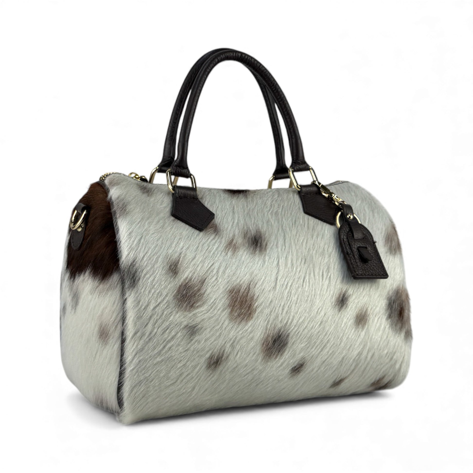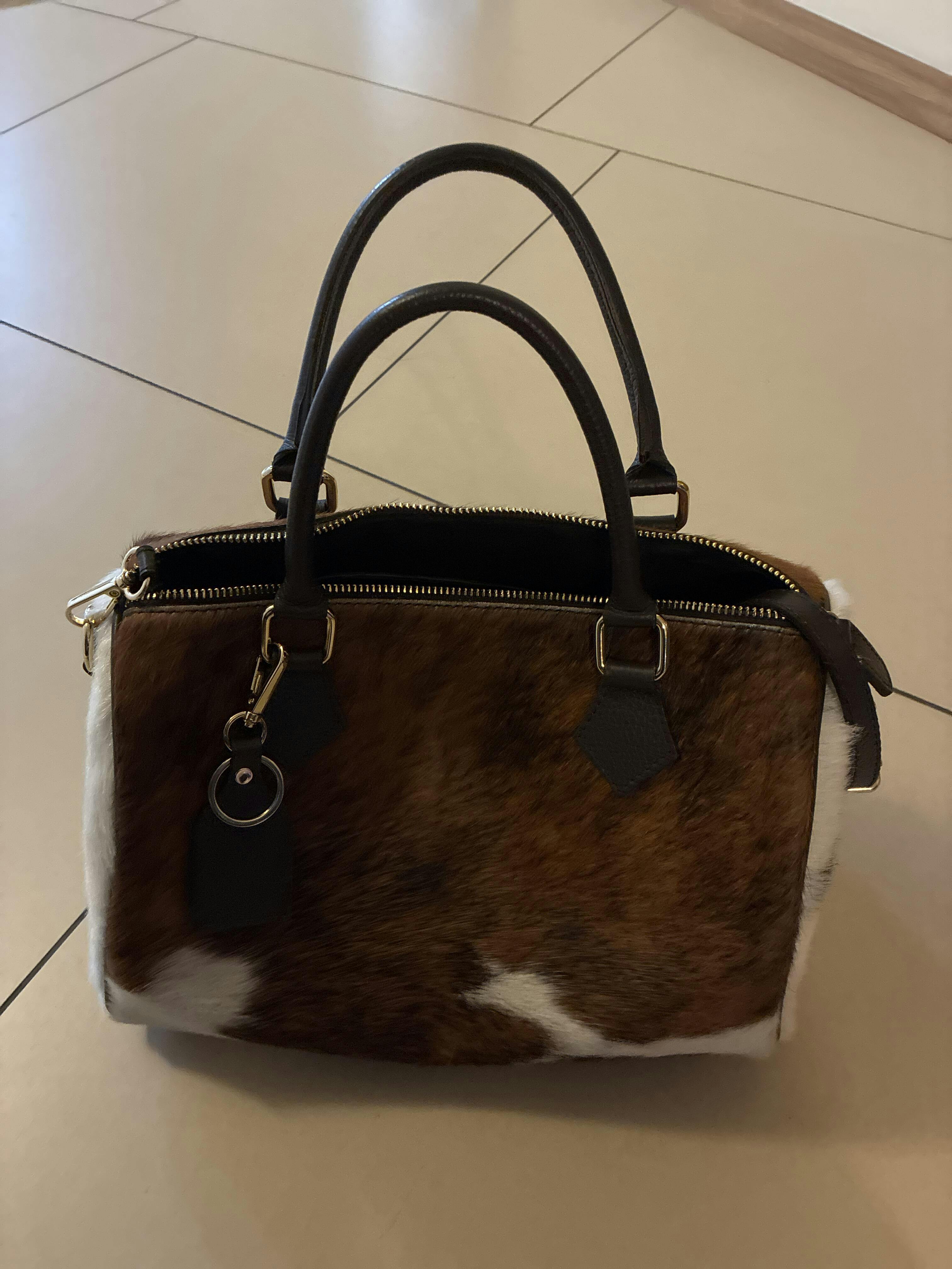 Realizzata in cavallino di bovino (pelle di mucca con pelo) nelle parti a pelo e in pelle bovina liscia sui manici, alterna toni naturali del marrone e del panna.Ogni borsa presenta una disposizione del pelo diversa, per questo ogni pezzo è davvero unico. I doppi manici in pelle liscia e gli accessori in metallo dorato completano il design, rendendola una borsa da portare a mano con grande personalità.