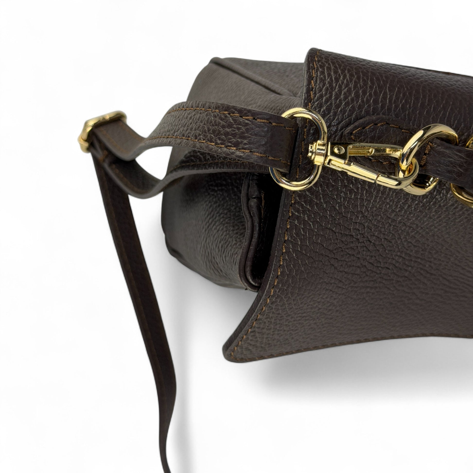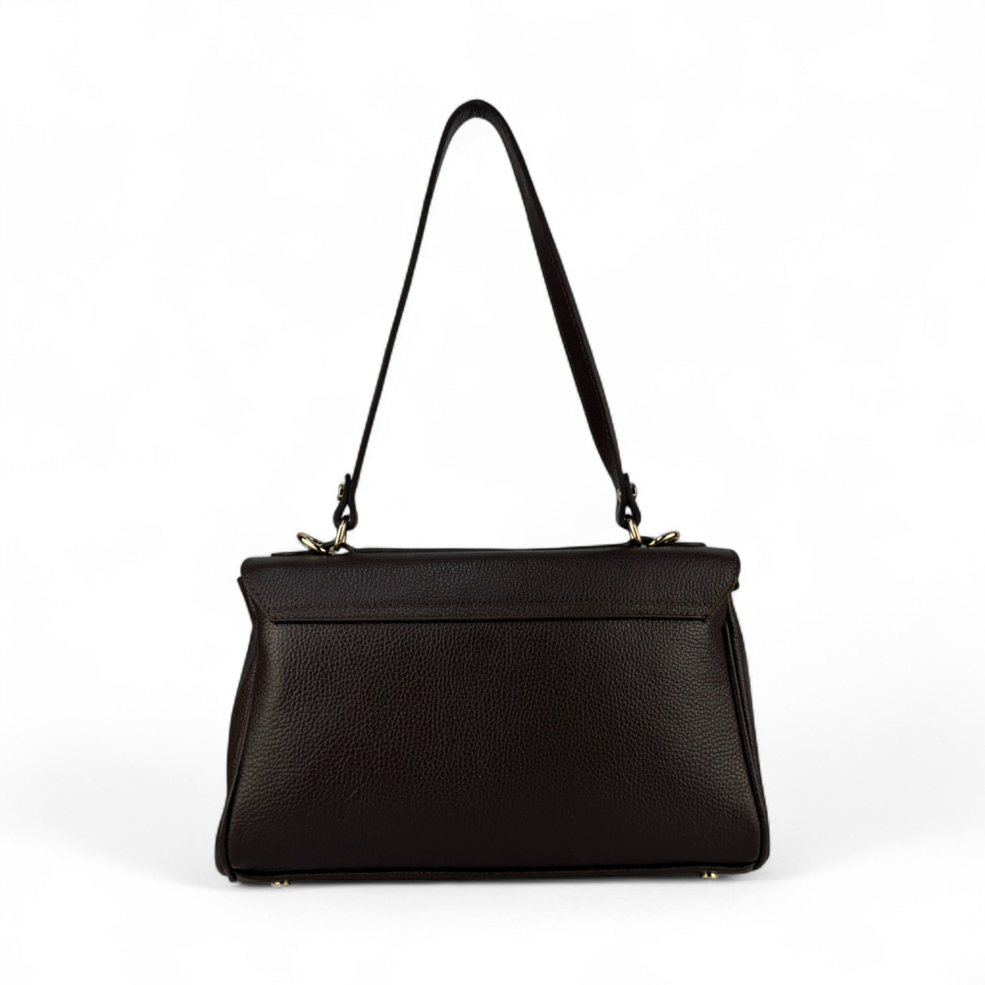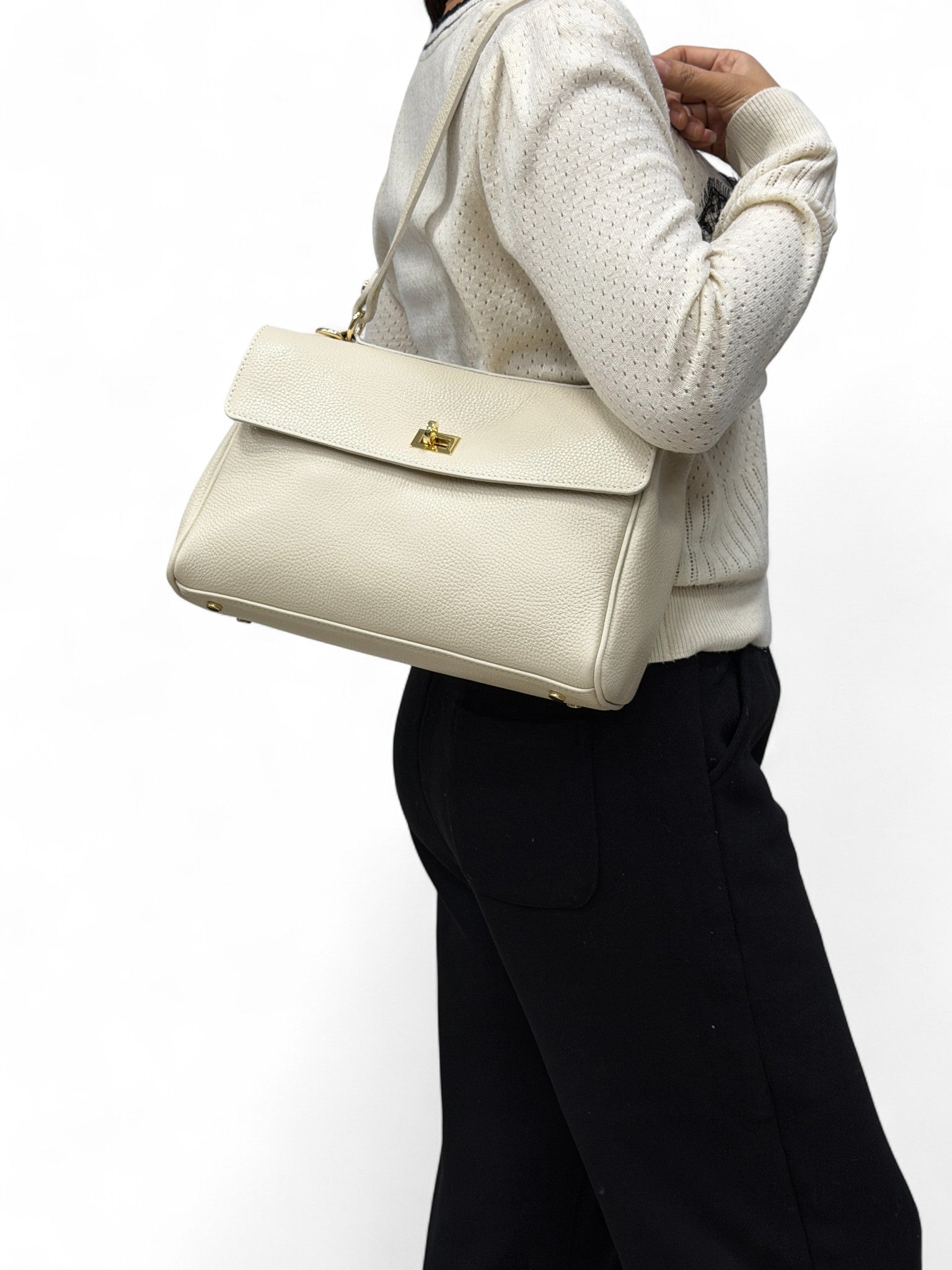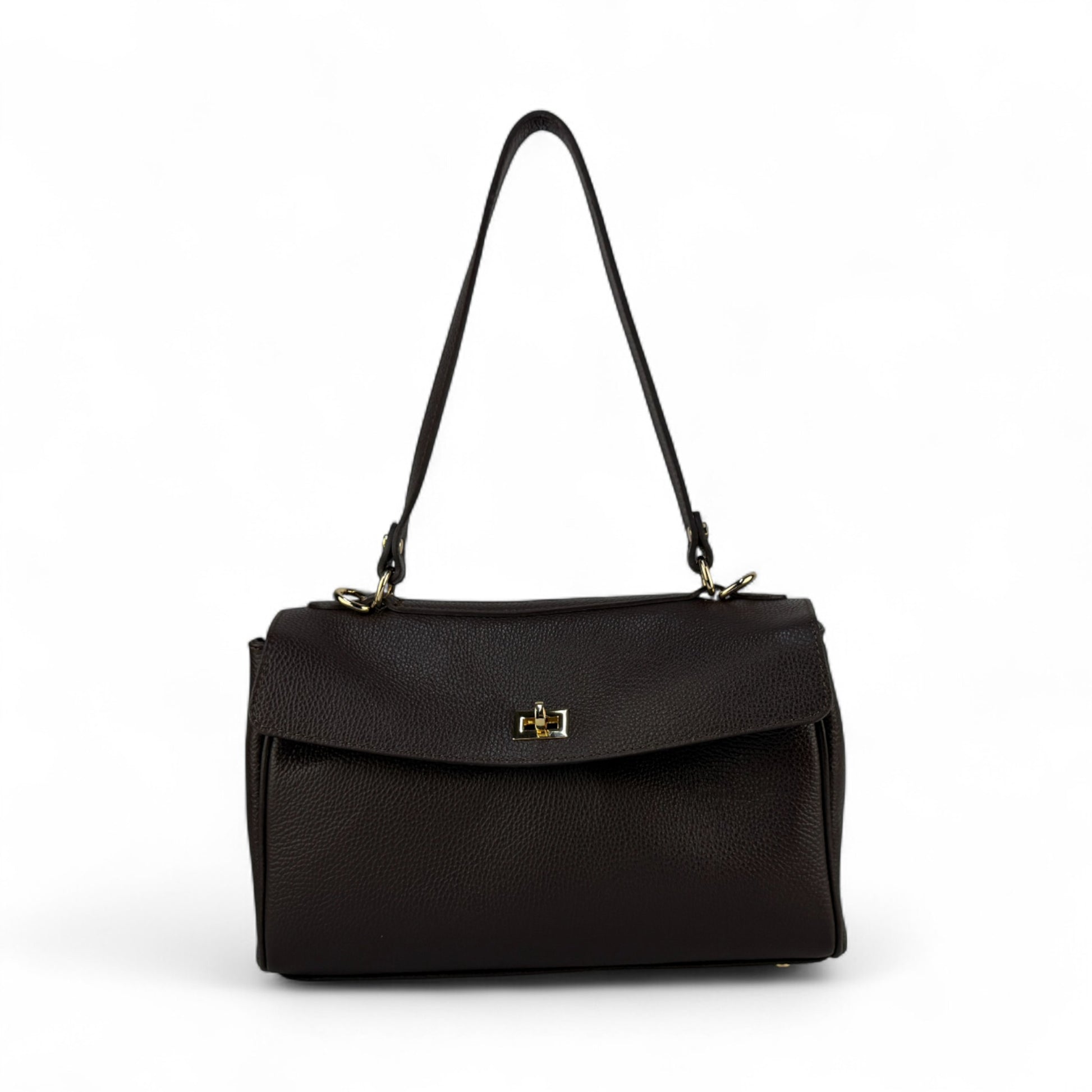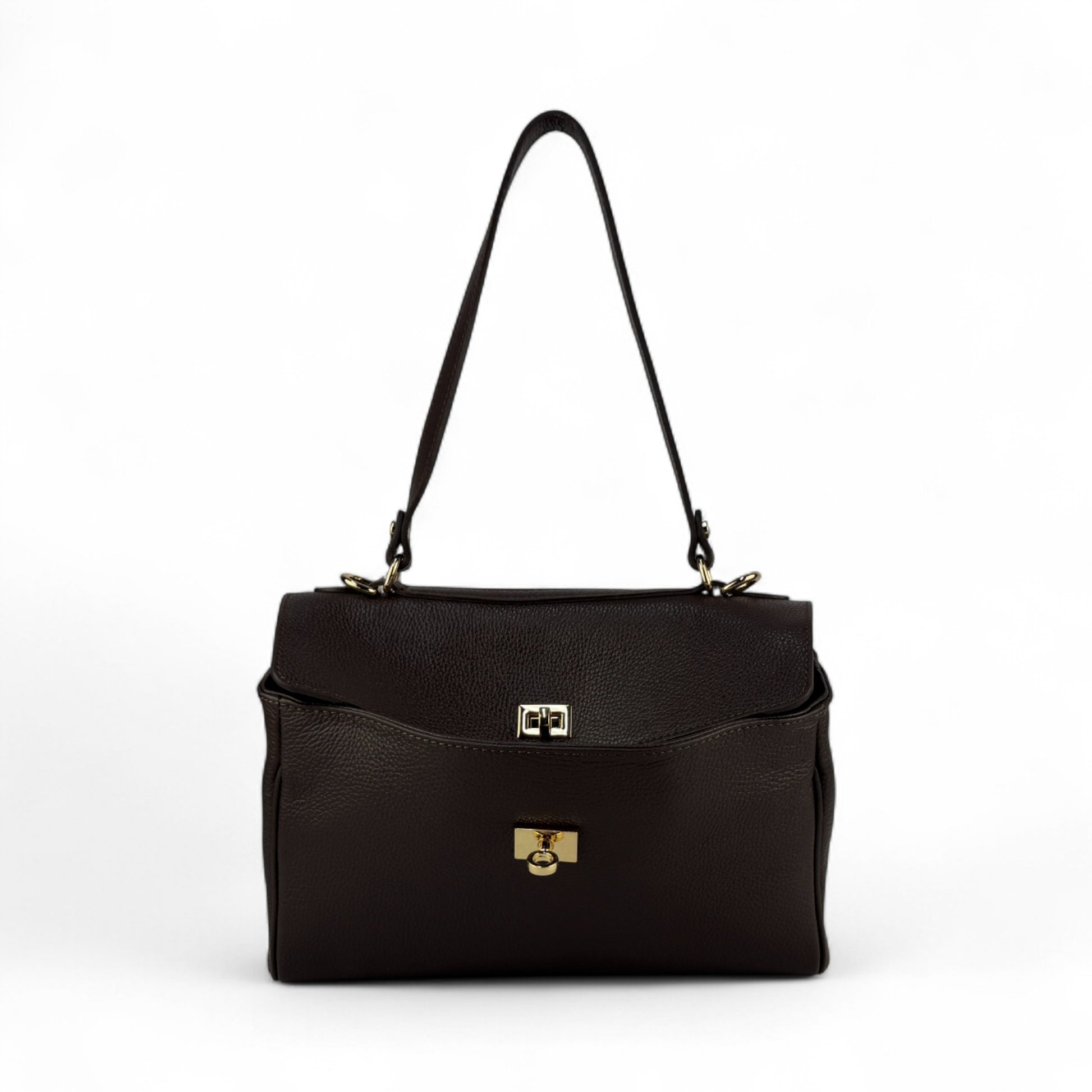 Realizzata in 100% vera pelle italiana martellata, ha una texture morbida ma strutturata che mantiene bene la forma. I dettagli in metallo color oro e la doppia chiusura donano un tocco prezioso: la pattina superiore si chiude con un girello discreto, mentre il lucchetto frontale può essere agganciato sia all’esterno sia alla parte interna, per un effetto più pulito e una maggiore sicurezza.