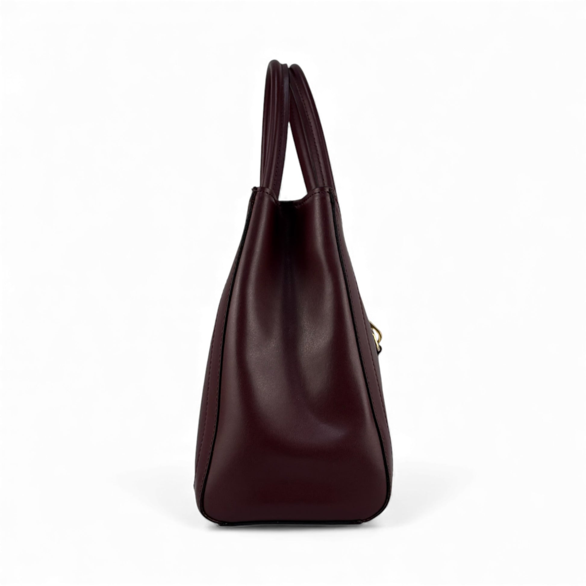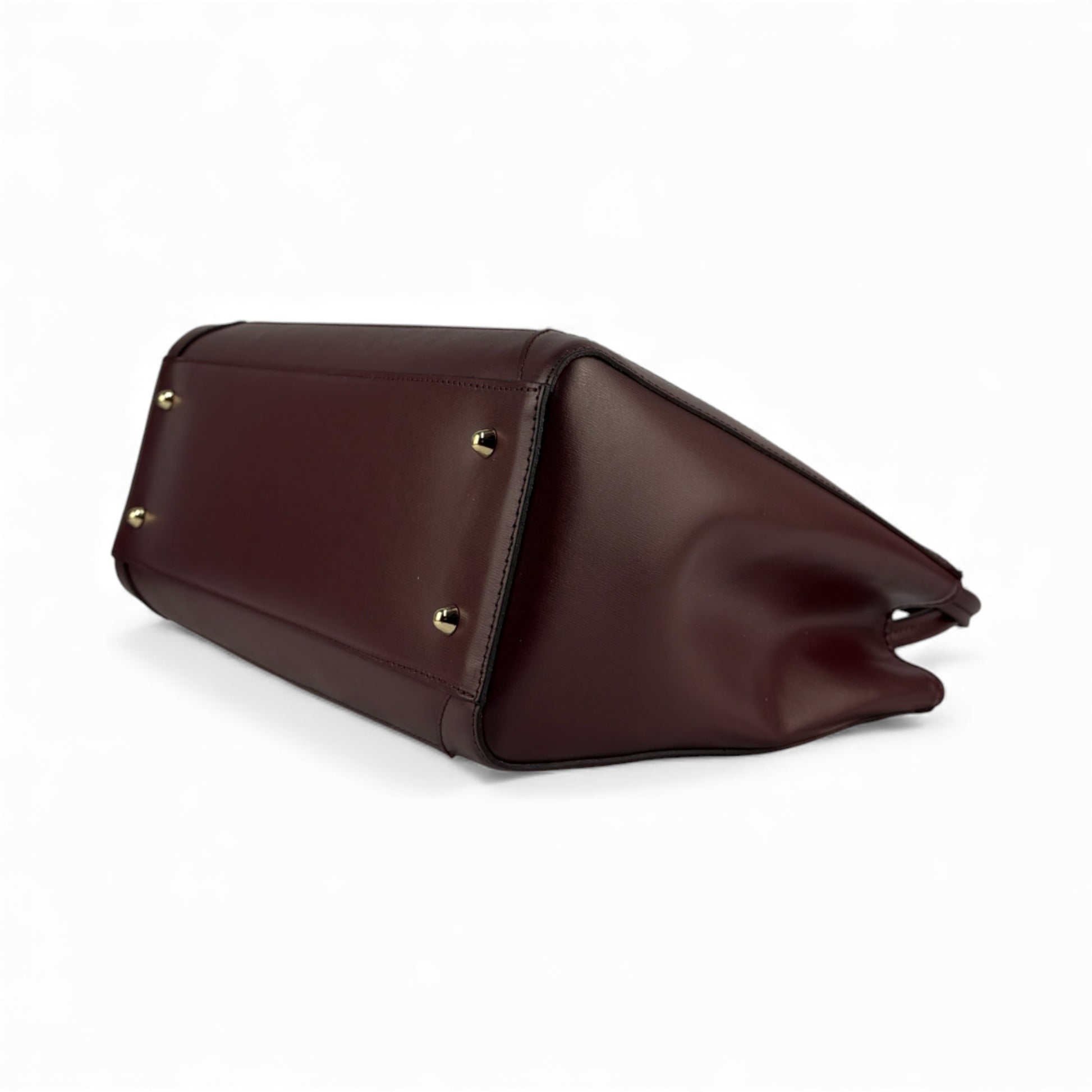 Realizzata in 100% vera pelle italiana liscia, ha una superficie compatta e morbida al tatto che esalta il colore pieno e i dettagli in metallo dorato. I doppi manici arrotondati permettono di portarla comodamente a mano o al braccio, mentre la linguetta frontale con moschettone aggiunge un tocco contemporaneo al design essenziale.